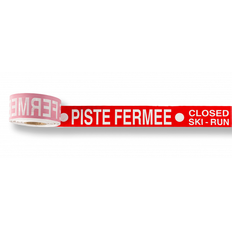 Rubalise rouge plastique - marquage blanc "PISTE FERMÉE" - dimensions : 1000 m x 0,10 m